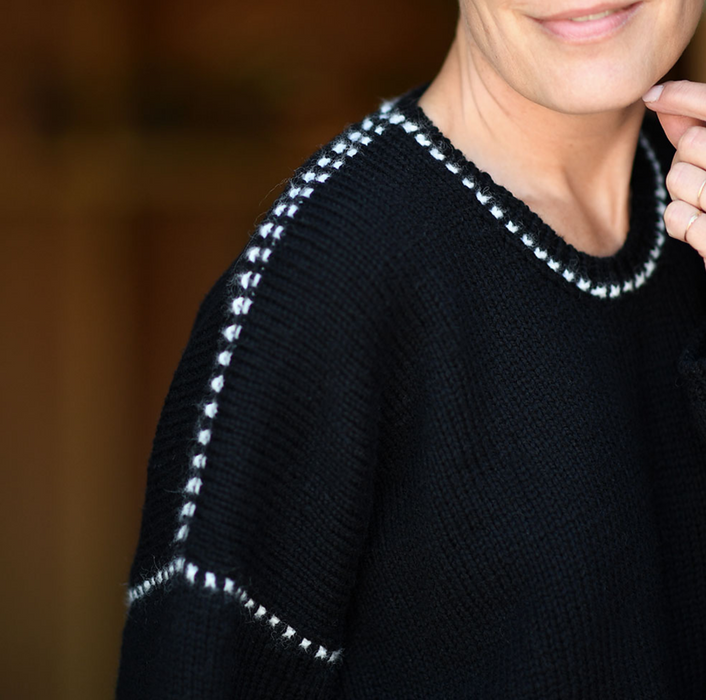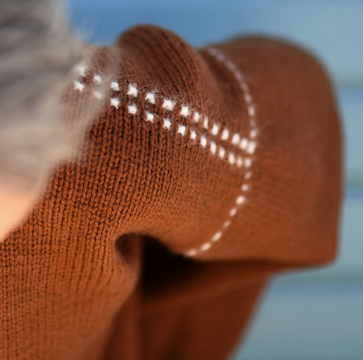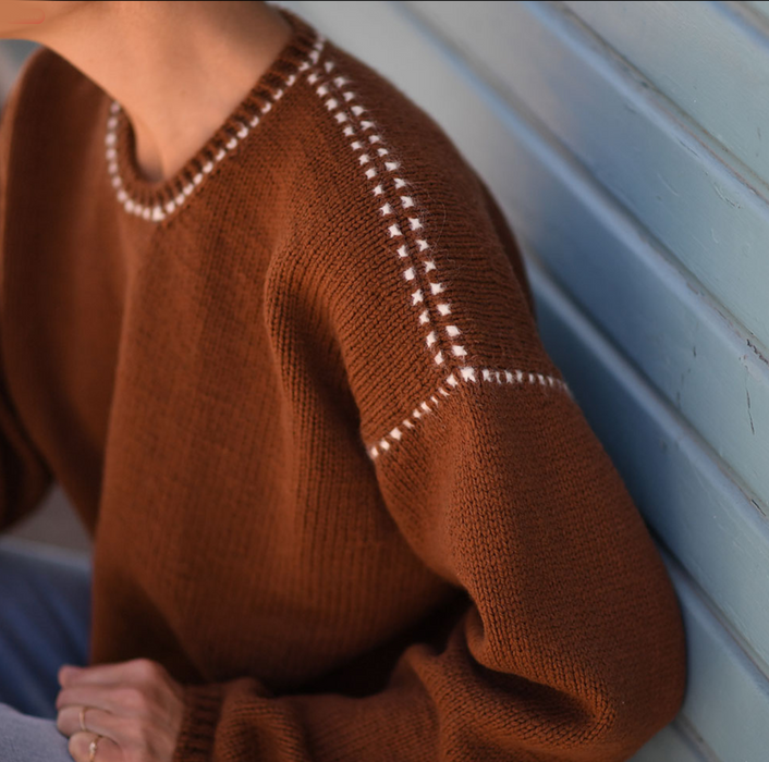 MONO SWEATER is a relaxed, top-down design featuring classic stockinette stitch with delicate dotted accents tracing the shoulders, armholes, and neckline. These decorative lines are created using an easy slipped stitch technique. Though they resemble stranded colorwork, the pattern is achieved using just one color at a time.