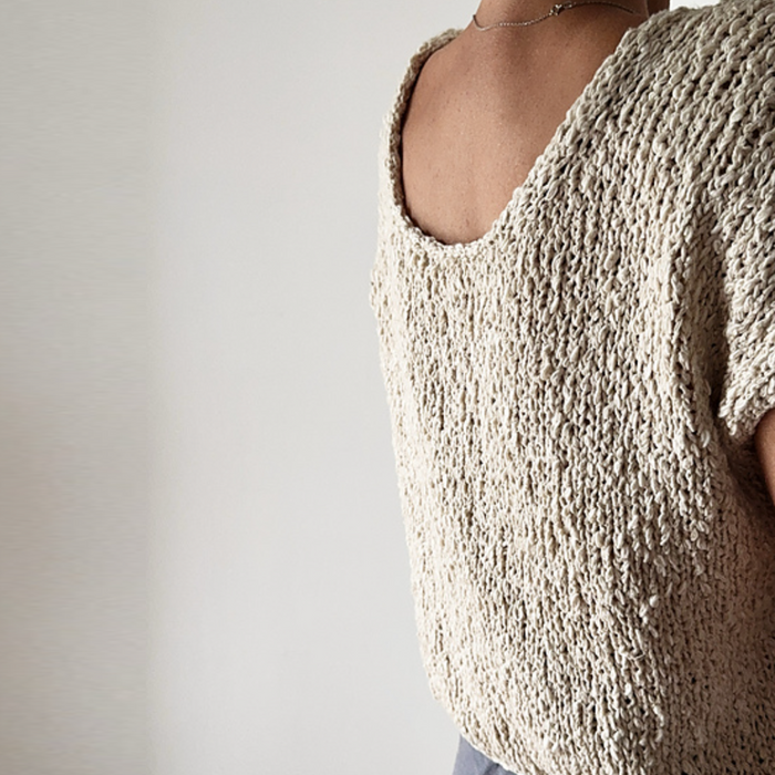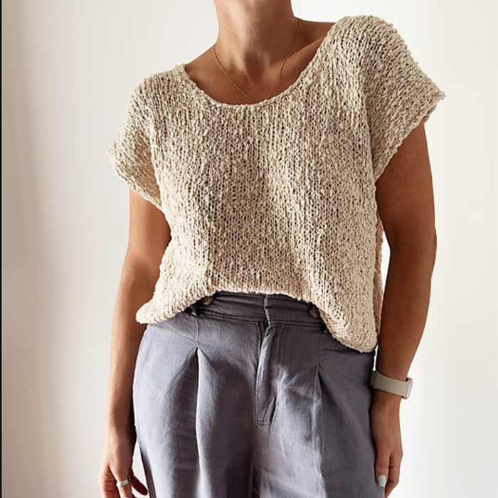 A relaxed, oversized tee with a modern silhouette, the Drop Cut Tee features a boat neckline, drop shoulders, and short sleeves for an effortlessly stylish look. Its flattering shape suits all body types, making it a versatile staple for any closet. Knit from the top down, this design combines flat and circular knitting in stockinette stitch. It’s slightly cropped, with a soft, airy texture, and boasts a subtle scoop neckline on both the front and back. The edges are finished with a sleek single-stitch i-cord bind-off for a clean, minimal touch. Choose your preferred size based on how much ease you’d like, and be sure to read the pattern thoroughly before starting.