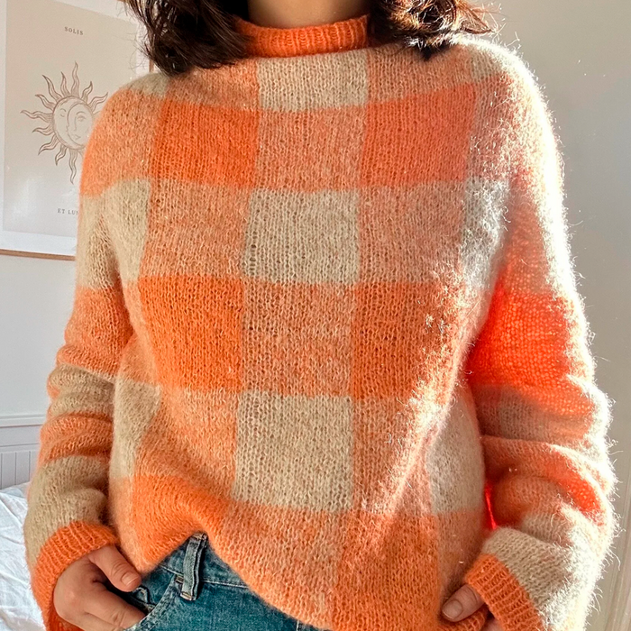 Important (!) about the yarn Midnatssol and light and dark colors: Some of the colors have a black “inner thread” and some have a white “inner thread”. The dark colors with the black inner thread are more fluffy with longer fibers. The brown and blue sweater uses yarn with the black inner thread. The coral and beige sweater uses yarn with the white inner thread. The correct gauge might be achieved with different needle sizes depending on which of these two yarn qualities that are used (thinner needle for the dark colors). The fabric of the sweater will be denser using the dark colours. Be aware that if you choose to mix a color with the black thread and one with the white thread, the structure of the fabric will vary between the 3 different colors of the squares/checks.