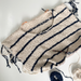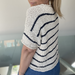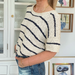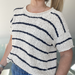 The Bandol Tee is a timeless t-shirt featuring a classic crew neckline and iconic nautical stripes. Construction begins with a provisional cast-on, knitting the upper back section in stockinette stitch. Next, the upper fronts are worked separately, shaping the neckline as you go. Afterward, the pieces are joined beneath the arms and worked seamlessly in the round. Once the body reaches the preferred length, a gentle rolled edge completes the hem. Sleeve stitches are picked up straight from the armholes for a smooth finish.